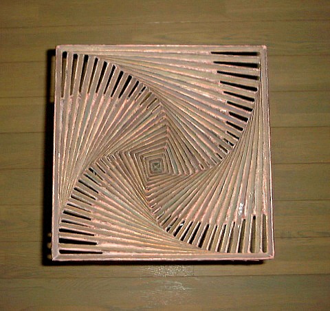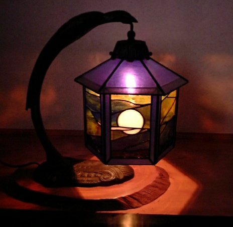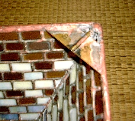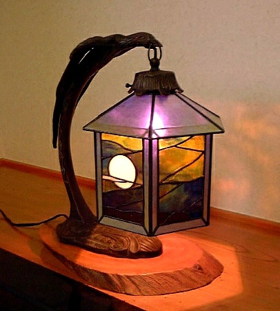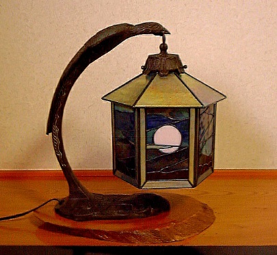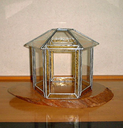 この試作品のトップにはキャップをつけて実際につり下げてみました。その後、トップをガラスでふさいで、一種のテラリウムとして用います。その目的で最初から2面をオープンにしておりました。 このランプの屋根と6面の縁のガラスはブルーのイリデセント(ブルズアイ社)なのですが、そのために、このランプは中の電球を灯すか否か、部屋の明かりを灯すか否か、昼間か夜の暗がりか、などなどの状況の変化によって様々な表情を見せてくれます。 (注:各画像をクリックすれば大きな画像。各ブラウザの「戻る」ボタンでこのページへ。)