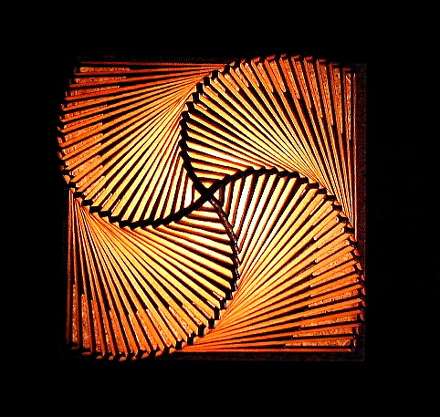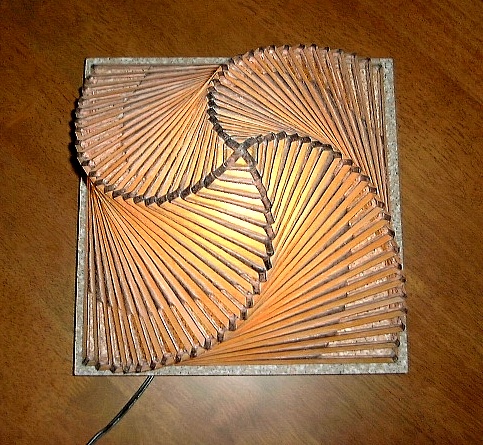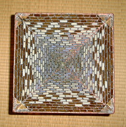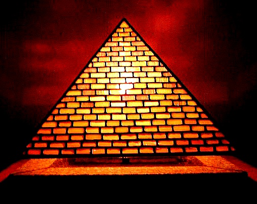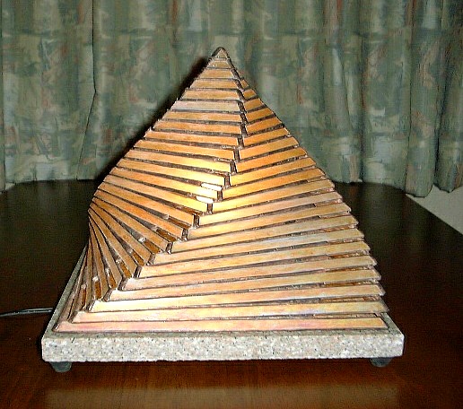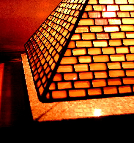 約半年前、ティファニーレプリカのベース「イーグル」を購入して以来、このベースに合うランプのデザインをあれこれ考えておりました。最終的にこのような「六角釣灯籠」のイメージが形をなしました。この背景には、あの安芸宮島の厳島神社の回廊を飾る釣灯籠があります。 ランプのデザインを決定する前に、ランプの大きさ、ベースとのバランスなどを確定するためにいくつも紙で試した後に、主としてクリア平版ガラスを用いて試作品を作りました。(次の二つの画像) (注:各画像をクリックすれば大きな画像。各ブラウザの「戻る」ボタンでこのページへ。)