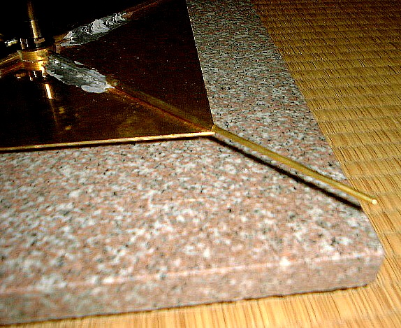 「ピラミダルU」ベースの赤御影石をさがしました。ある大きな「DIY(Do it yourself!)」の店で適当な石材(300x300x20mm)を見つけました。これは上面のみが磨き上げられた敷石用の建材(恐らく中国産)で、全体が白っぽくて、本来私の思い描いていた「赤御影」とは異なります。しかし、サイズがぴったりだし、何といっても値段が大変安かったので(数百円)、妥協しました。 この石材の中央に径 10mm の穴をあけ、側4面を砥石やペーパーなどで磨き、ベースとして仕上げました。さて、このスパイダーとランプ本体を結合するための工夫をうまく説明できるがどうか不安ですが、以下述べてみます。 このベースにランプ本体を浮かせるための自作装置を取り付けました。基本的には本体を支えるのは4脚スパイダーですが、これだけでは本体の全重量を支えきれないと思い、厚さ 2mm の真鍮板(180x180mm)をスパイダーの下に添えて補強することにしました。(下の一番左の画像) 真鍮板上にハンダで固定しているスパイダーの「脚」のように見えるは、実は内径 3mm の真鍮パイプで、そのパイプの中に本来のスパイダーの「脚」を中心から 50mm ほど入れています。さらに、このパイプの中には適当な長さ(およそ 40mm)の「押しバネ」が入っています。このパイプにさらに、適当な(必要な)長さの真鍮棒(径 3mm、本来のスパイダーの脚と同径)を入れます。この真鍮棒は「押しバネ」の作用で 30mm ほどパイプの中に押し込むことができます。この 30mm の真鍮棒の「動き」が、ランプ本体をスパイダー(ということはランプベース)に結合することになります。(下の左から二番目の画像) ランプ本体の裏面全体は下の左から三番目の画像のようになります。この 4 角を真鍮板で補強した上、中央に角から中心に向かって内径 3mm の真鍮パイプ(上記真鍮パイプと同じ)をハンダで固定します。この 4 角のパイプの中に上記の「動く」真鍮棒を差し込むわけです。(下の左から四番目の画像) ただし、ランプ本体とベースの上下の間隔が 30mm ほどしかありませんから、ランプ本体と石材ベースのそれぞれの角を一致させたまま、4 角のパイプの中に「動く」真鍮棒を差し込むことはできません。そこで、角のパイプに真鍮棒を差し込む際は、スパイダーを45度回転させて作業します。その後、ランプ本体と石材ベースの 4 角を合わせて完成です。(下の一番右の画像) (注:各画像をクリックすれば大きな画像。各ブラウザの「戻る」ボタンでこのページへ。)