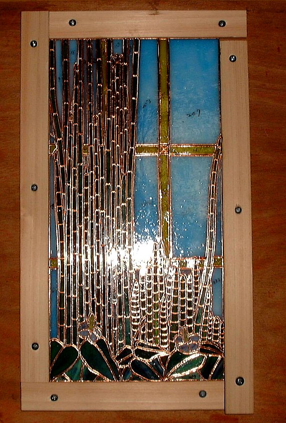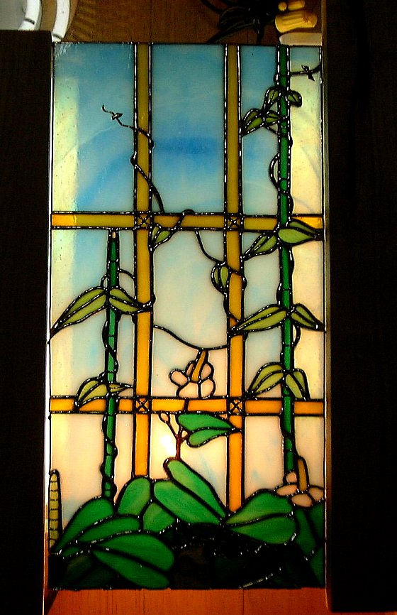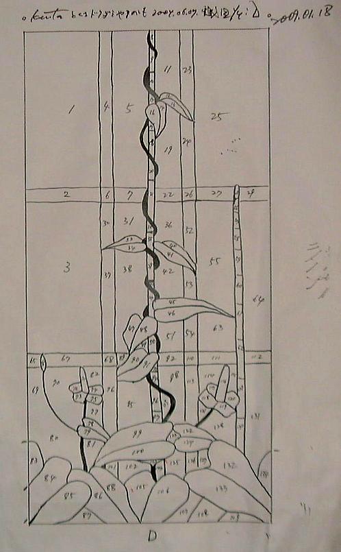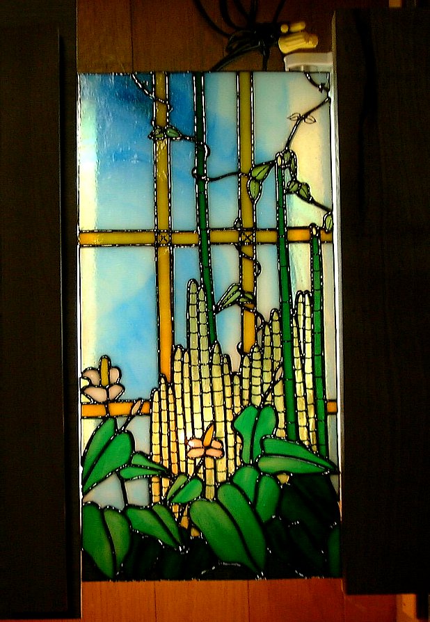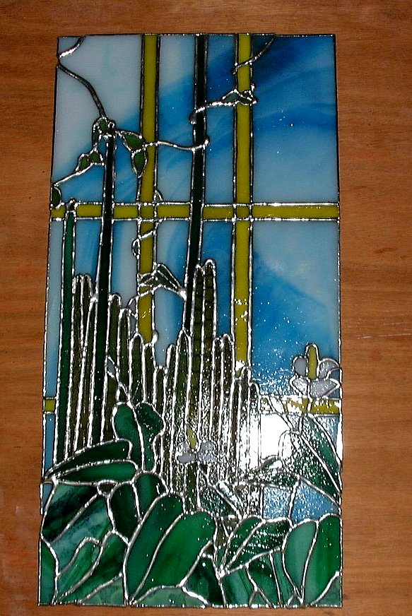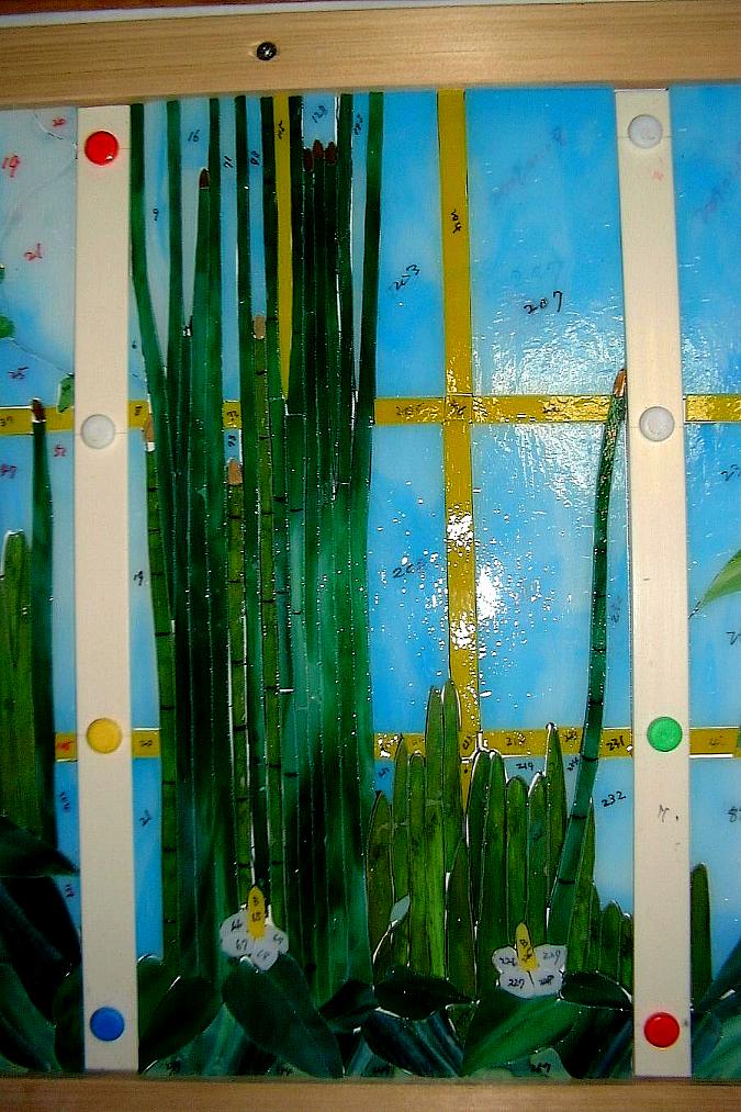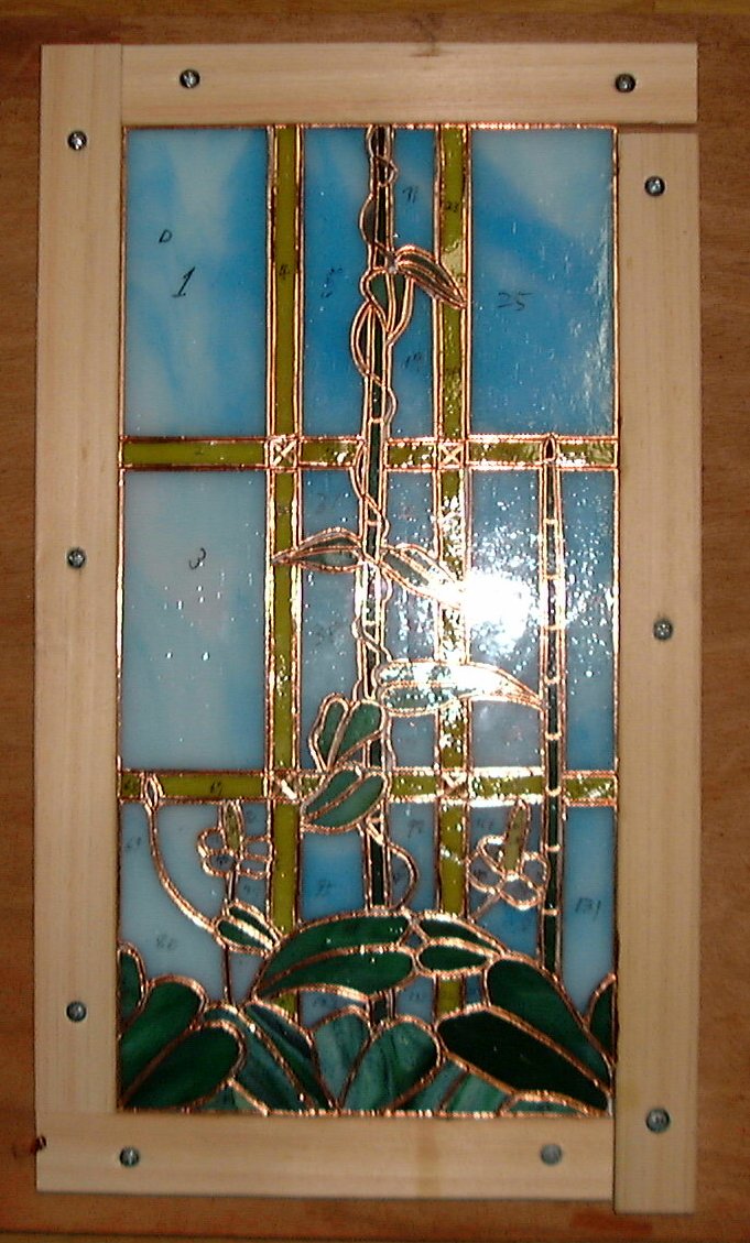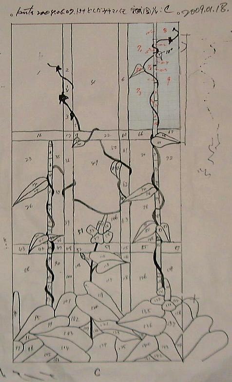 この原図(カラー)を作る前に、自宅庭の植物たち、トクサ、ドクダミ、ヤマノイモの写生、それらのデザイン化で苦労しました。それらの3種の植物だけではどうしてもステンドグラスの作品として、パネルを構成するデザインは無理でした。そこで色々考え、実際にはなかった竹垣のイメージを利用するアイディァが浮かびました。結果的には、この大きな格子状の竹垣が作品全体の統一感を醸し出しているようです。