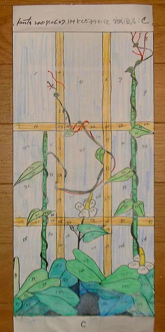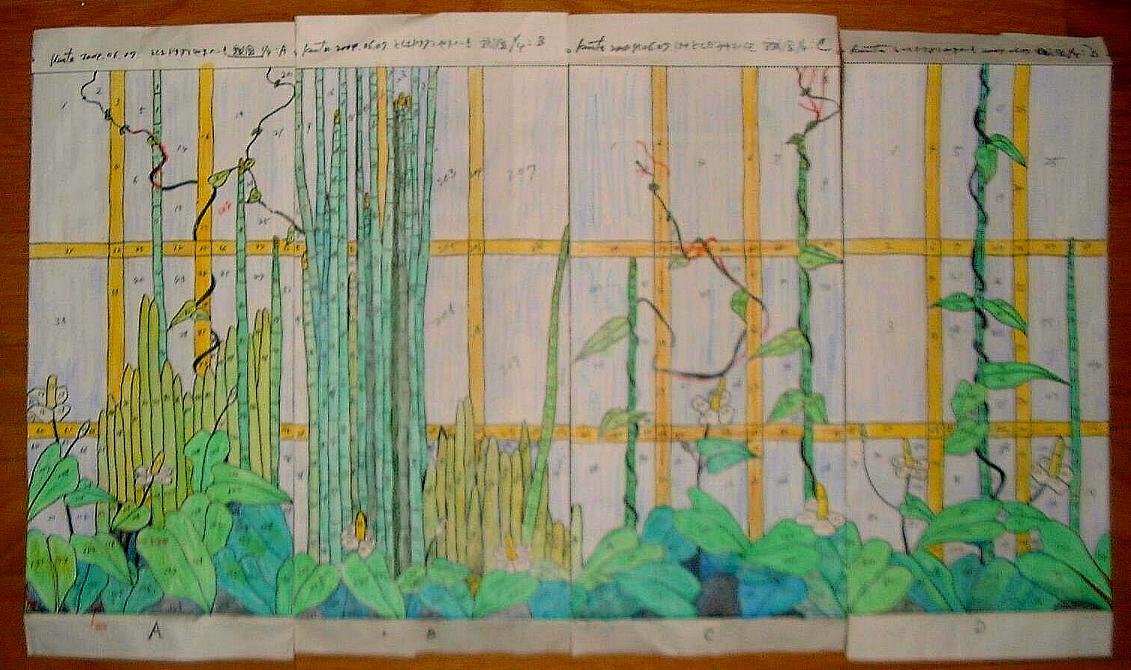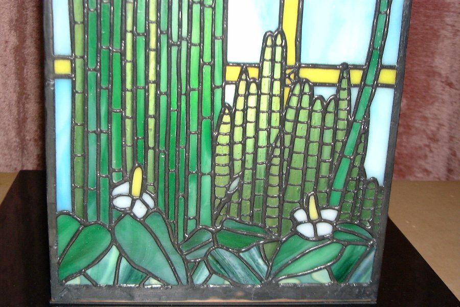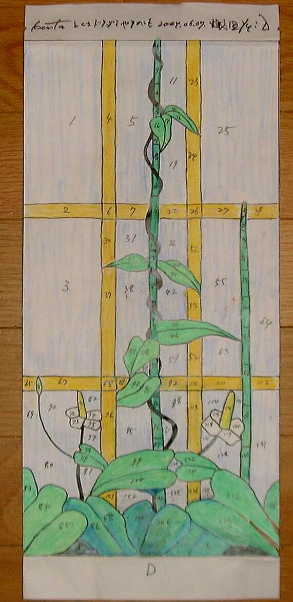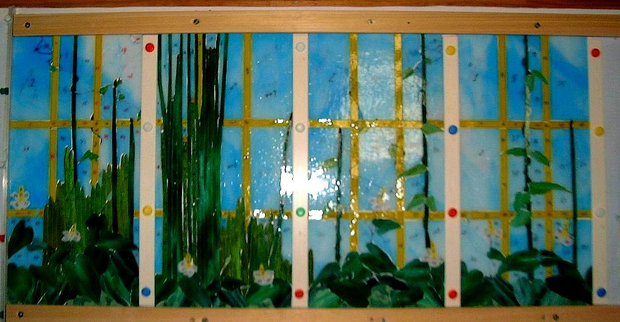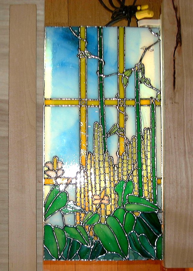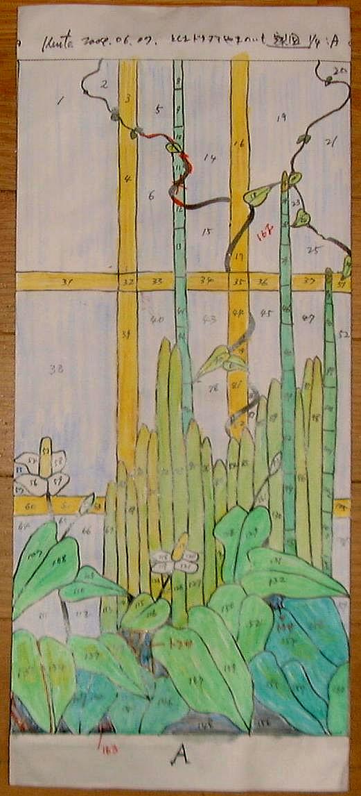 この原図(カラー)を作る前に、自宅庭の植物たち、トクサ、ドクダミ、ヤマノイモの写生、それらのデザイン化で苦労しました。それらの3種の植物だけではどうしてもステンドグラスの作品として、パネルを構成するデザインは無理でした。そこで色々考え、実際にはなかった竹垣のイメージを利用するアイディァが浮かびました。結果的には、この大きな格子状の竹垣が作品全体の統一感を醸し出しているようです。