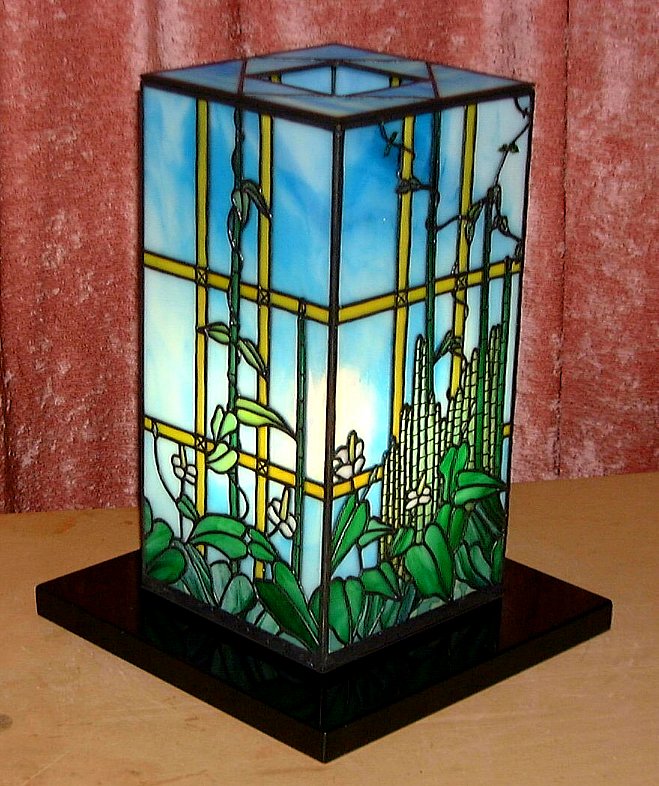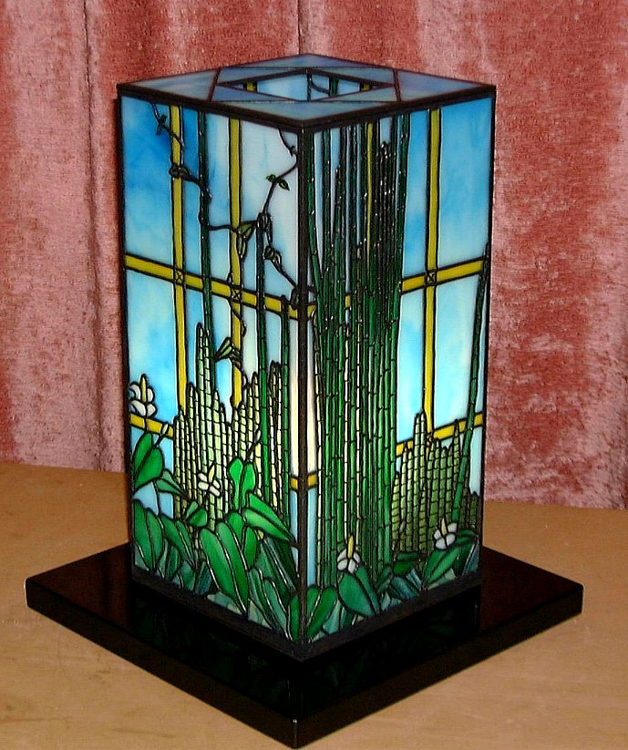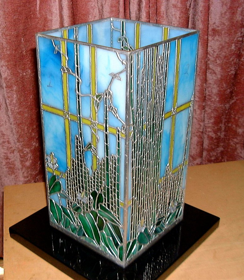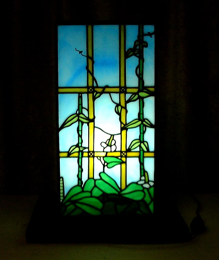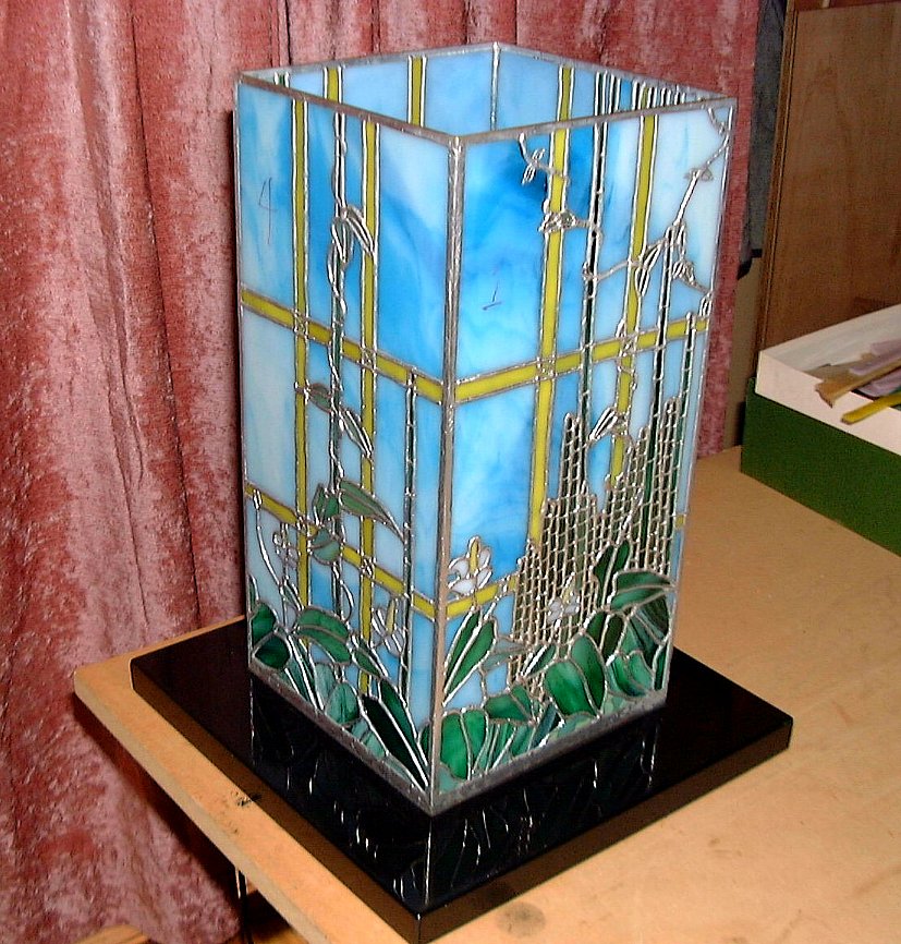 前々から構想していた作品全体の姿は、アンドン形式4面体、ベースは木製平版、トップ覆い(取り外し可能)、デザインのモチーフは自宅庭の植物たち、4面のデザインは連続することなどでした。