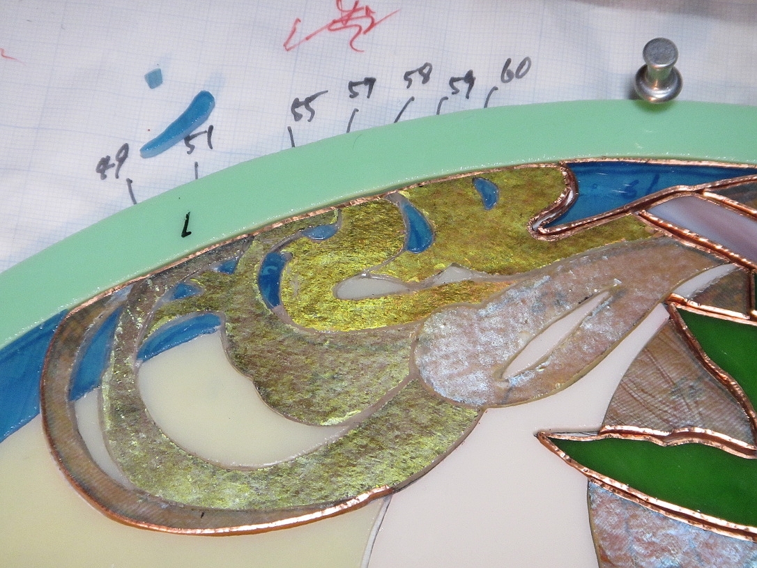 コパーテープ・ハンダ処理のラインは隙間が目立つ。各ピース間を厳密に寄せていないこともあるが、最終的に整え、隙間が大きすぎる場合ピース再作成となるかも知れない。しかし、ハンダラインの大小・強弱はステンドグラスの味わいの一つであり、全ピース完成段階で検討する。
