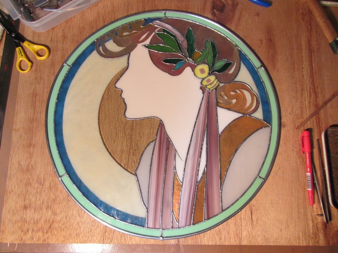 髪の毛の流れをこわさないようにピース割りをしたが、その結果、通常のステンドグラス作成ではあり得ないようなピースカットをしなければならないことになる。