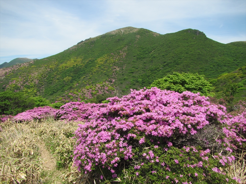 B左:ピンクに染まる平治岳と北大船山(星生山山頂から)、C右:縦走路のミヤマキリシマ