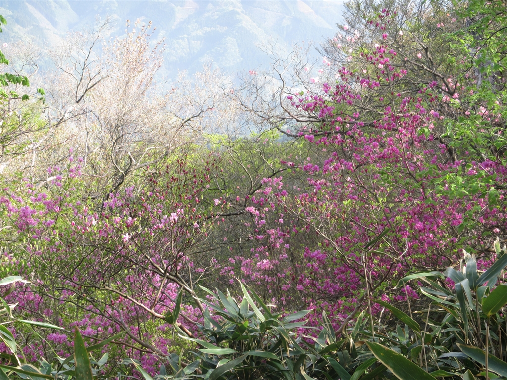 左:背振縦走路大岩基部のツクシシャクナゲ(2022年5月2日(月)鬼ヶ鼻岩)、右:背振縦走路のミツバツツジ(同左)