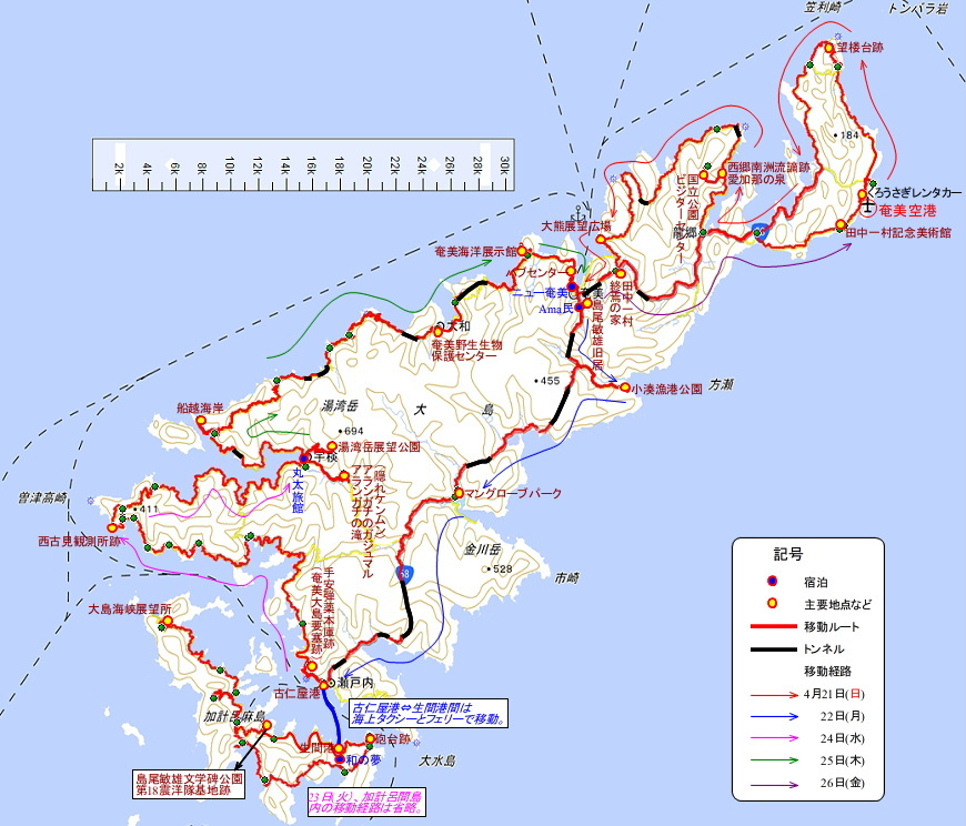 - 観光・訪問・見学は別として、今回の旅行で印象的だったのは国道、県道、地方道の整備がよくなされ、車の走行は非常に快適ということである。海岸沿いと内陸部のルートはトンネルによってカーブと高低差が軽減されている。そのトンネルが多い。第1日目、名瀬のゲストハウスでは食事提供がないので外に出て夕食を摂った居酒屋の店主によると、奄美大島と同じ陸地面積でトンネルの距離を比較すれば大島が日本で一番である、とのことである。旅を終え、なるほどと思った。なお、下の「旅行全図」には、短いトンネル(記号、黒線)未記入。