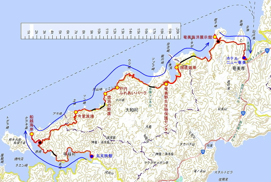 [行程] 今里漁港 09:40⇒[10分]⇒09:50徳浜展望所・ヒエン浜(10分)10:00⇒[5分]⇒10:05 戸円ふれあいパーク ⇒[25分]⇒10:30 奄美野生生物保護センター(40分)11:10⇒[10分]⇒11:20 国直海岸 ⇒[20分]⇒11:40 奄美市大浜海浜公園・奄美海洋展示館(見学、昼食など、1時間40分)13:20⇒[ホテルを探して名瀬の街中をうろつき、50分]⇒14:10 ホテルニュー奄美