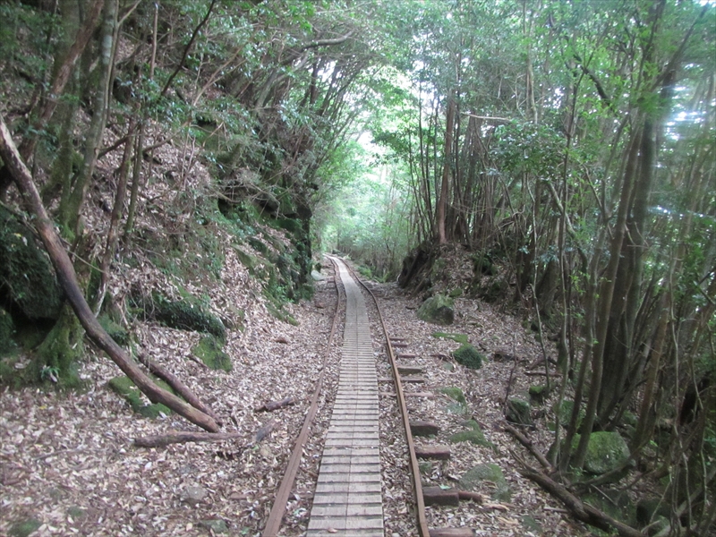 20160819_yakushima037.jpg トロッコ軌道を歩く、傾斜はない 軌道中央に歩道が設置されている |