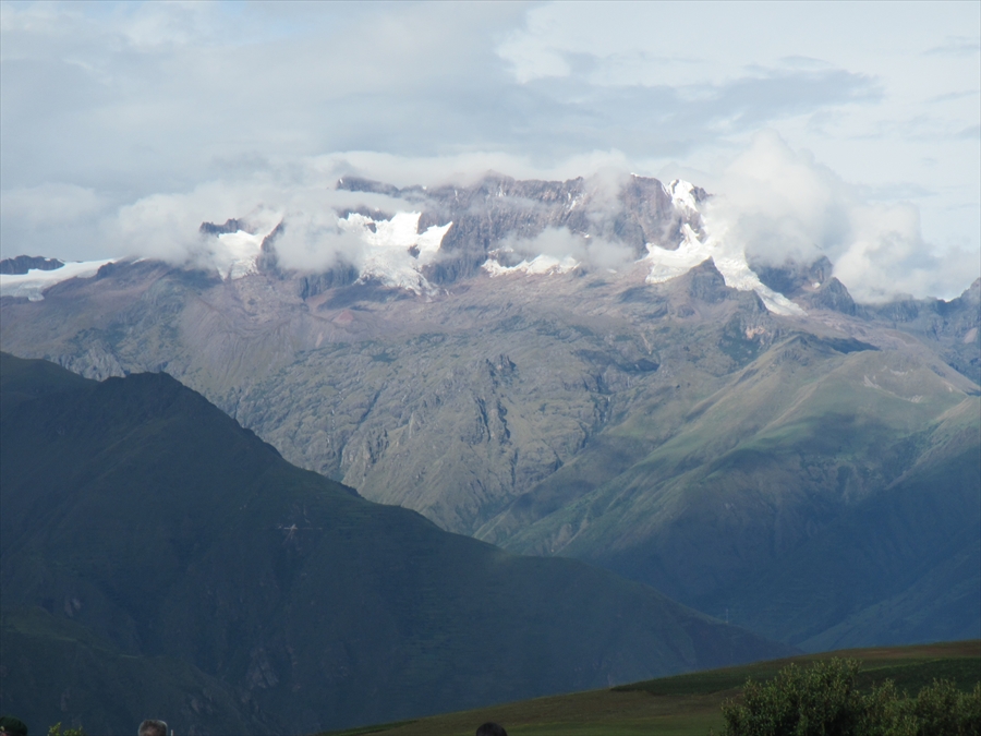 対岸の山腹 格子状の箇所はかつての食糧倉庫 中央、岩の像はインカの「神」 |