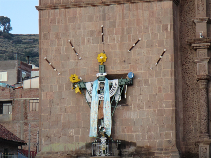 プーノ大聖堂の壁面 昨夜のお祭りの主役らしい もちろんキリスト |