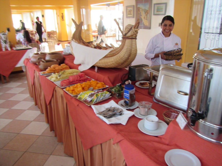 ホテルの朝食 ウェイトレスさん、にこやかに トトラ船の飾りがしゃれている |