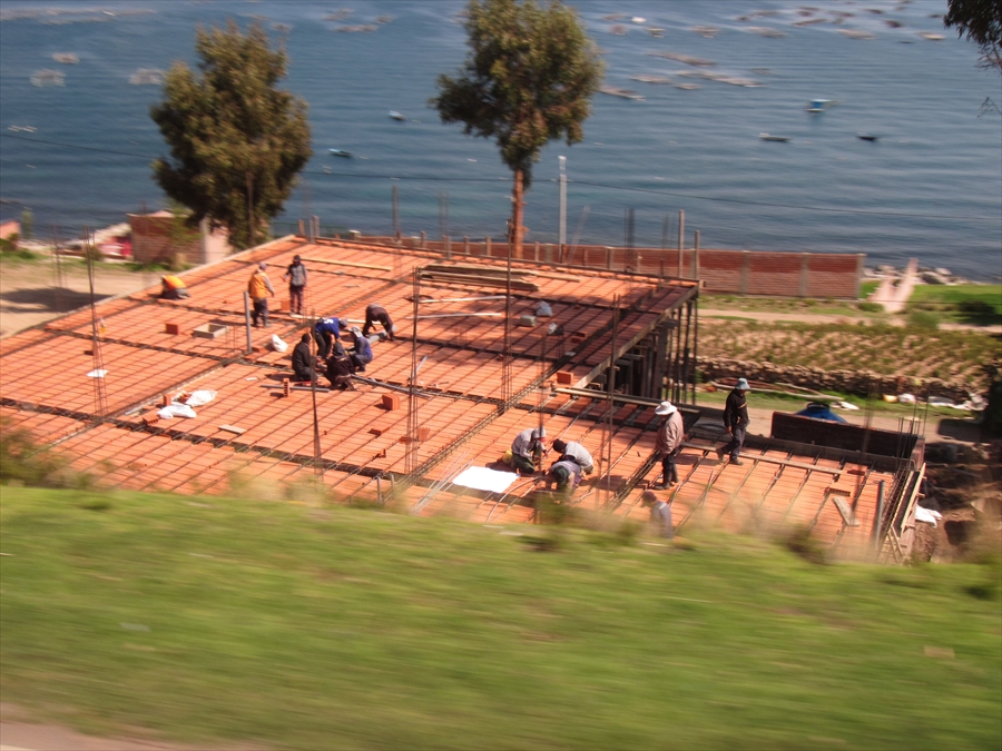 静かなチチカカ湖畔に沿って走る |