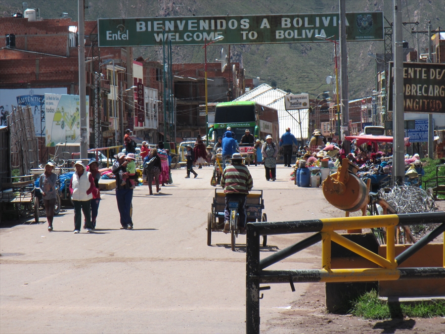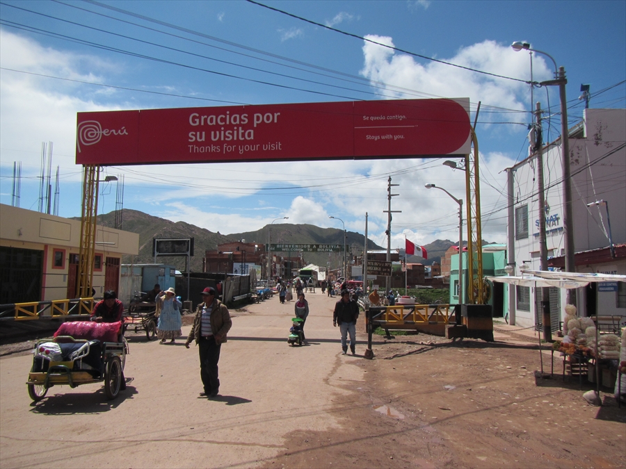 ペルー・ボリビア国境 手前赤の看板がペルー 向こうの黒がボリビア |