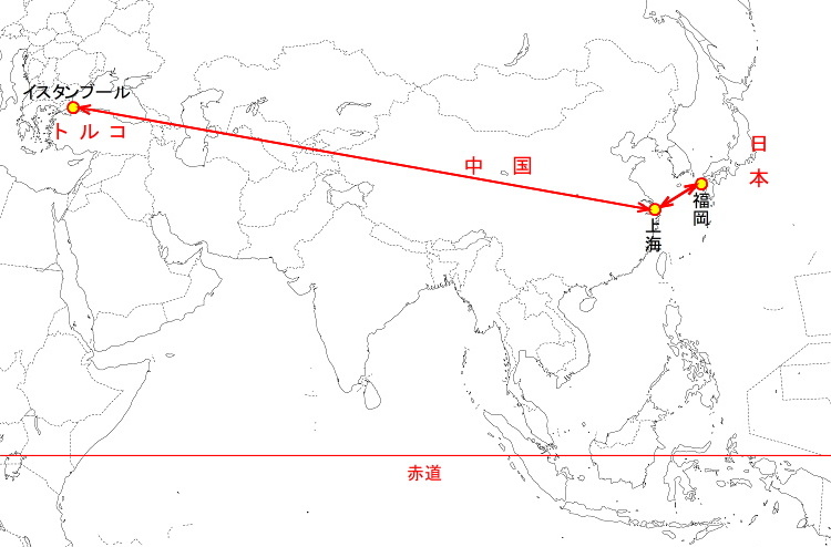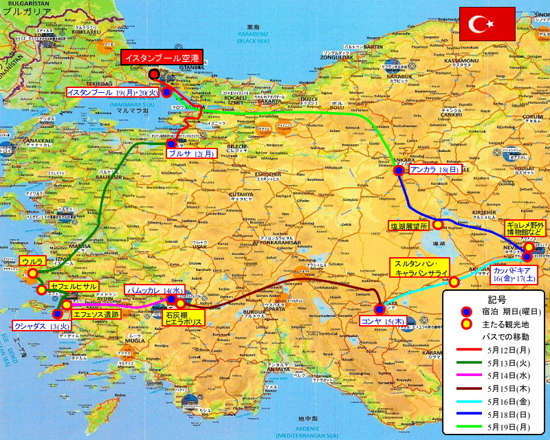 [トルコ旅行全図] (注1)ツアー初日参加者に配布されたトルコの地図を基に。 (注2)バスでの移動経路は極めて不正確。 (注3)「主たる観光地」はすべての観光・立ち寄り地点を示してはいない。