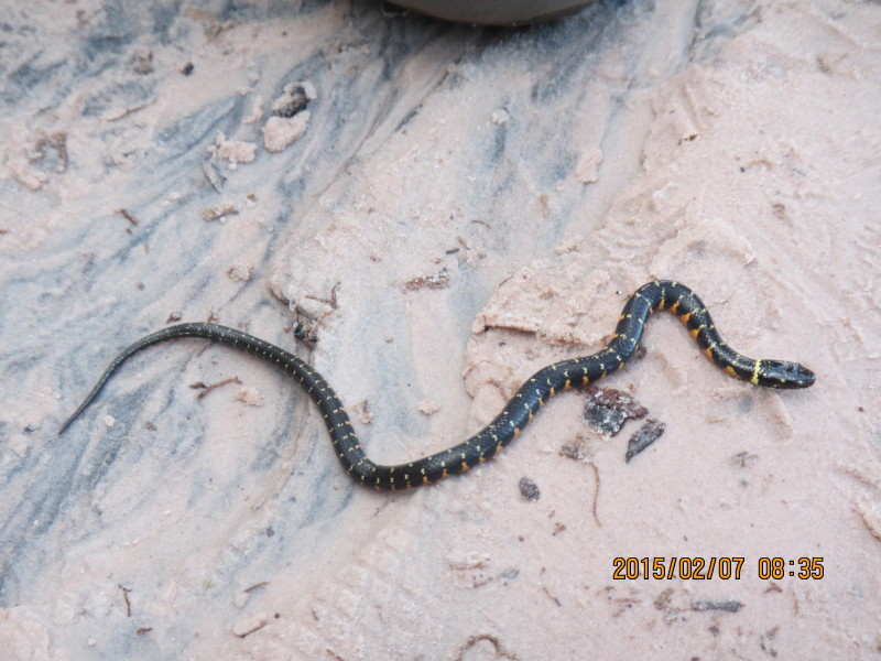 guiana_0207_0011.jpg アチャの滝の裏に潜るため上陸した岸辺 ヘビ、とても小さい(1尺=30cmくらい)、赤ちゃんかも知れない、水中に棲むらしい |