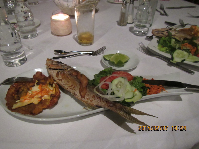 guiana_0207_0045.jpg 夕食、メインは(恐らくカリブ海の)魚のフライ 久し振りの魚料理 |