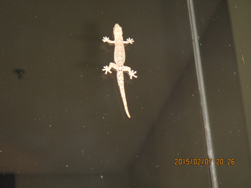 guiana_0207_0048.jpg ふと見ると、玄関ガラスの壁にヤモリ 日本のヤモリより色白でちょっとスマートのような…… |