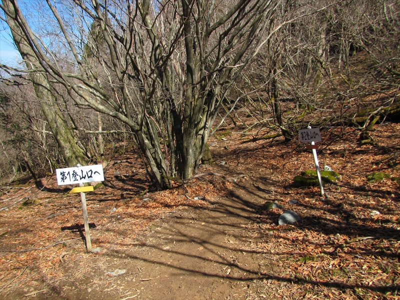 20170304_017.jpg 仏石分岐、登山道の十字路地点 左:第1登山口、右:トラバースの道 |