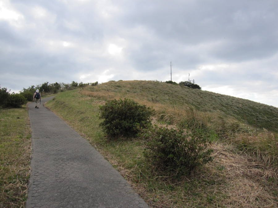 帰路、遊歩道が駐車場に近づく辺り、右へ分岐する遊歩道へ入り、大瀬山へ向かう。 「無電之址」、海上保安庁電波塔の緩やかなピークを通り大瀬山に到る。 大瀬山山頂には「祈りの女神」像と鐘がある。展望もすばらしいが、なにしろ曇り空で景色が映えない。残念。 山頂から近道を通って駐車場に降り、奥の駐車地に戻った。 |