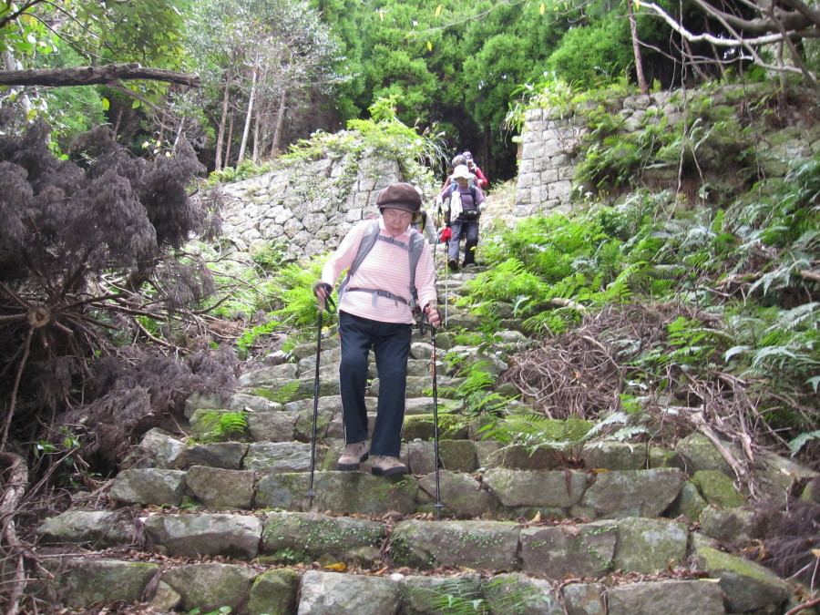 寺脇分岐から登山後半開始、直後いきなり急坂の直登20分。樹木を切り開いた登山道が、文字通り一直線に上に延びている。 急登の上、上の方では大きな岩が重なっていて登山道も明確ではない。進路を確認しながらあえぎあえぎ登った。 このきつい登りを終えて小休憩。そこから先は父ヶ岳の手前まで楽しい尾根歩きと思っていたのだが、これが大間違い。そんな手軽な歩きは許されなかった。 登山道ははっきりしており、迷うことはないのだが、大きなピークを3つほど越えて行かねばならなかった。これは地図を読んで予想していた道の状況とはまったく異なっていた。 小さなピークも含め、この登山道はトラバースすることなく、忠実に尾根を走っている。これらのアップダウンは七ツ岳のピーク群よりもよほど大きく、きつく感じられた。しかも、往復するのである。 この父ヶ岳は福江島最高峰であるにもかかわらず、登山道に人があまり入っていないようであったが、なるほどそうであろうと納得できた。 山頂への最後の急登後、やっと父ヶ岳に着いた。しかし、山頂からの展望はあまりよくないし、狭い。 この山頂で昼食を摂ったのだが、空模様が怪しくなったので、長居はせず、下山開始。 寺脇分岐まで、1〜2回の小休憩を取ったのみ、ほぼ一気に降りてきた。登りよりも20分あまり早かった。 寺脇分岐に戻ると一安心、あとは登山口まで20分下るだけ。 その安堵感と達成感のためであろう、そこで撮った記念写真の皆さんは実にニコヤカであります。 寺脇分岐からの下山は巨木コース。 |