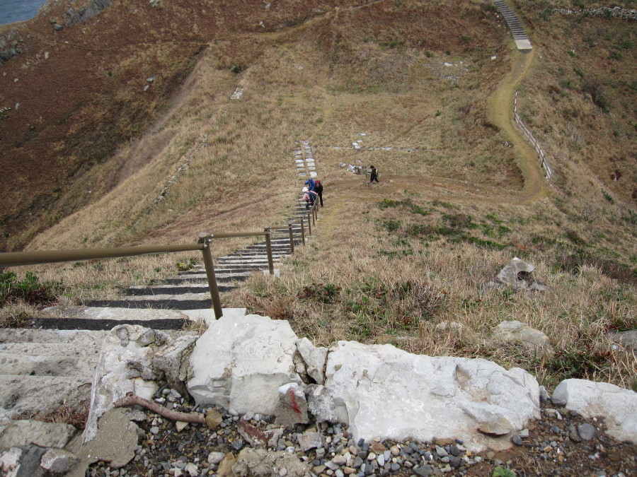 教会の次は大瀬崎灯台と大瀬山である。灯台を見て帰路大瀬山に登ることにする。 大瀬崎駐車場奥から灯台への遊歩道に入る。遊歩道はコンクリート舗装で、緩やかに灯台へ下る。約1.2km。 北西の風が強いが、樹林が風を遮ってくれるので歩きやすい。しかし、舗装遊歩道は雨に濡れて滑りやすいので用心しながら下る。 やがて樹林帯を抜け、灯台の建つ岬が眼前に広がる。左右は断崖絶壁の景観。遊歩道と階段をジグザグに下り、鞍部から灯台へ登る。 観光客は我々だけである。もっとも、この灯台まで往復するだけでも1時間以上かかること、帰路の登りがきついこと、などを考えると、普通の靴を履いた観光客が気安くここまで来るとは思えない。 灯台から曇天のもと、荒波の立つ東シナ海を眺めた。また、大瀬崎のすさまじい断崖も見渡せた。 今や無人の大瀬崎灯台は岬の先に堂々と、孤立して立っていた。 |