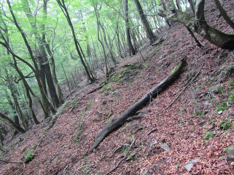 - さて、八丁越から大障子岩までの往復は難儀であった。二つの大小のピークは急坂の上り下り、岩場・ロープ場あり。登る途中で右脚膝が痛み出した。これまで以上にゆっくりと進む。